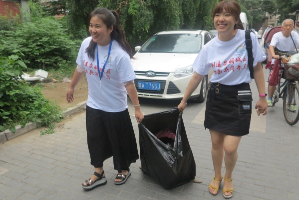 上午9點,大家一同走進人定湖西里社區,積極分工合作,有的撿拾白色垃圾、有的清理綠化帶中的雜物、有的運輸垃圾等。盡管烈日當頭,蚊蟲叮咬,但大家毫無怨言,干勁十足,都在為做維護公共環境的實踐者和保護者盡一份責任。